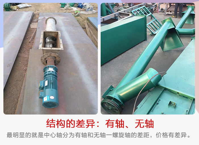 移動式螺旋輸送機在結構特點上其是有所差距的。其中最明顯的就是中心軸分為有軸和無軸,雖然他們就只有一螺旋軸的差距,但是價格還是有幾百甚至上千元的差異,具體差異要以型號差異為主。