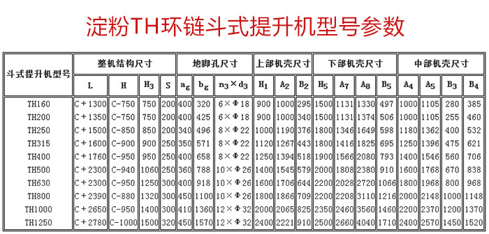 粉TH環(huán)鏈斗式提升機型號有TH160、TH250 、 TH315、TH400 、TH500等。同時大漢機械支持產(chǎn)品特殊定做,根據(jù)您的要求為您定制出合適的設(shè)備!