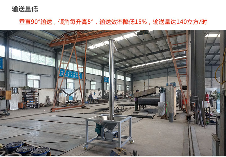 垂直螺旋輸送機(jī)采用垂直輸送的方式,其傾角為90°,在輸送中,輸送機(jī)的傾角每升高5°,輸送效率就會降低15%,因而造成輸送量較低,只能達(dá)140立方/時(shí)。