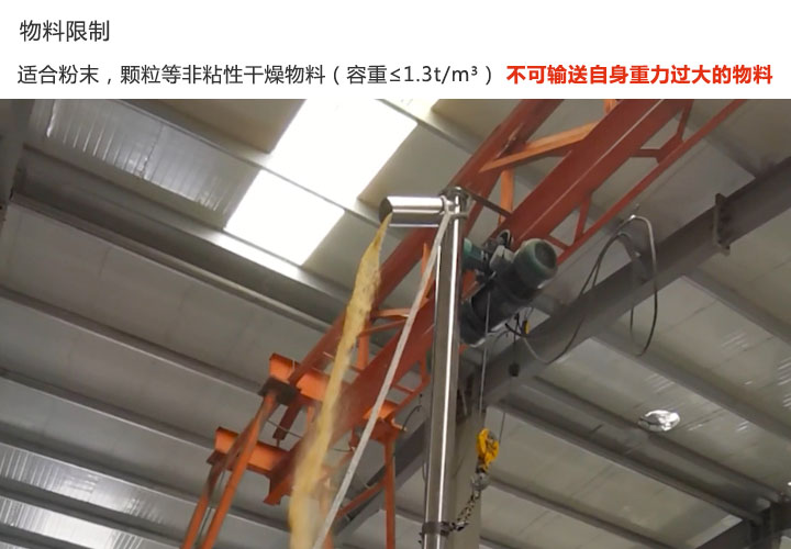 垂直螺旋輸送機(jī)只用于輸送粉末或固體顆粒等非粘性干燥物料(容重≤1.3t/m³),因?yàn)槠洳捎孟蛏陷斔停谳斔瓦^程中物料自身重力如果過重,會造成輸送難以進(jìn)行。
